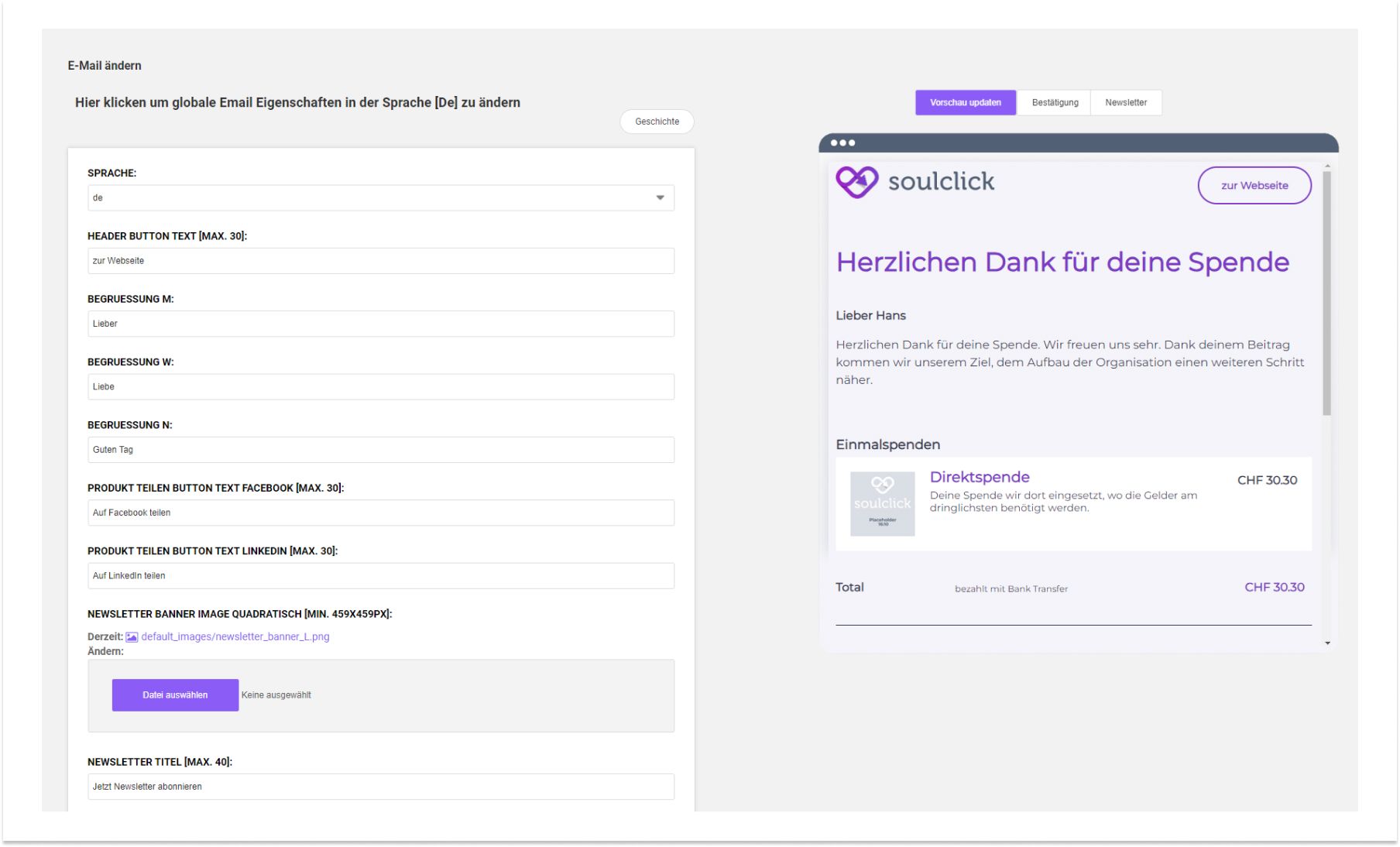 Mit Version 1.3 führen wir das Multi-Currency-Feature für Spenden in Fremdwährungen ein, erweitern den Soulclick Manager um ein Kontaktmodul zur zentralen Verwaltung eurer Kontakte und bieten neu einen E-Mail-Previewer für Standard-Mails direkt im System.