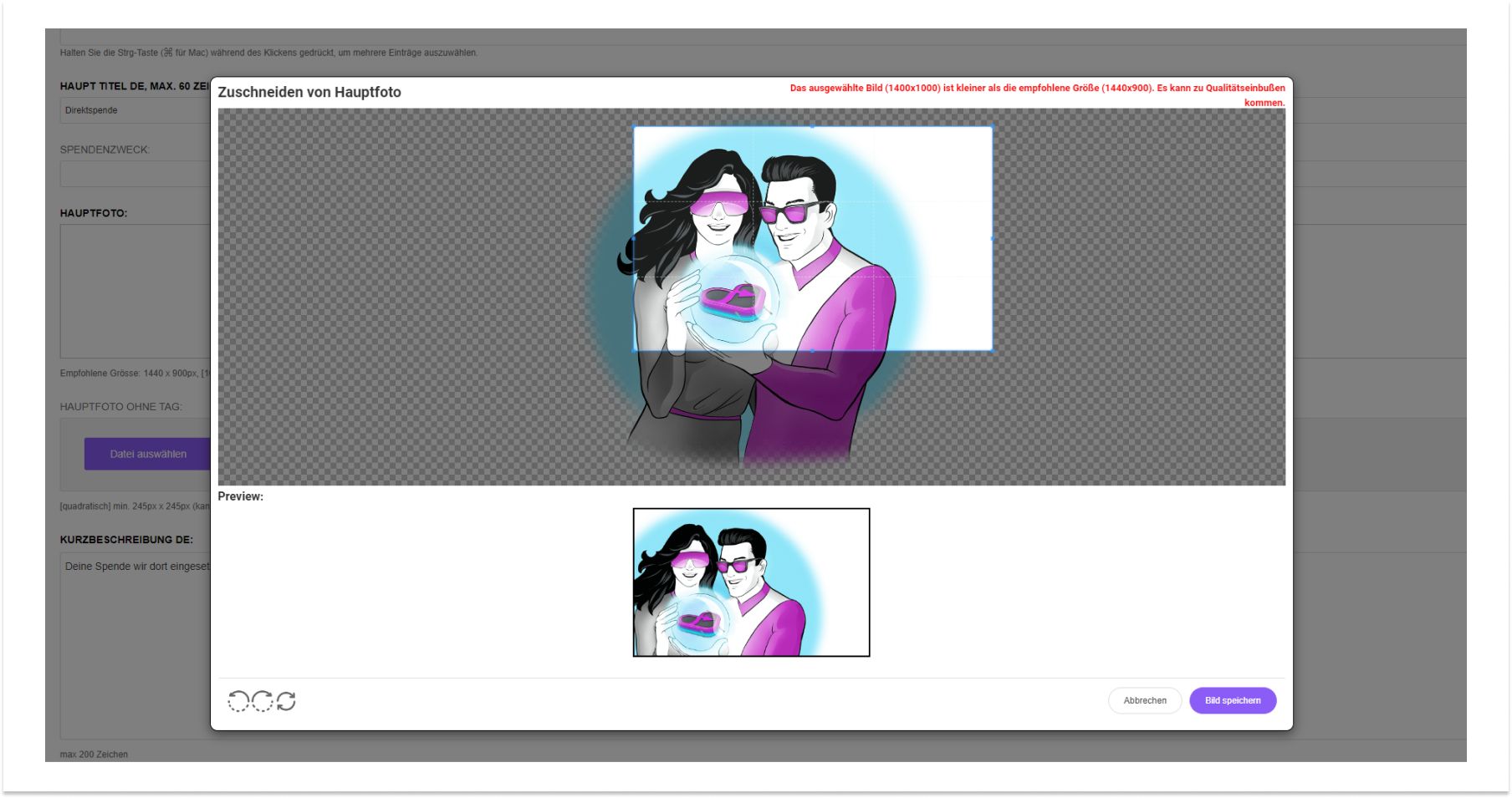 Neu können Bilder direkt im Soulclick CMS zugeschnitten und bearbeitet werden. Ein pixelgenaues Hochladen von Haupt- und Produktbildern entfällt somit. In der Vorschau erhältst du zudem eine Fehlermeldung angezeigt, sollte die Bildqualität gering sein. Auf den Landingpages der Spendenprodukte werden die Bilder weiterhin vollautomatisch auf die passende Grösse angepasst und komprimiert.
