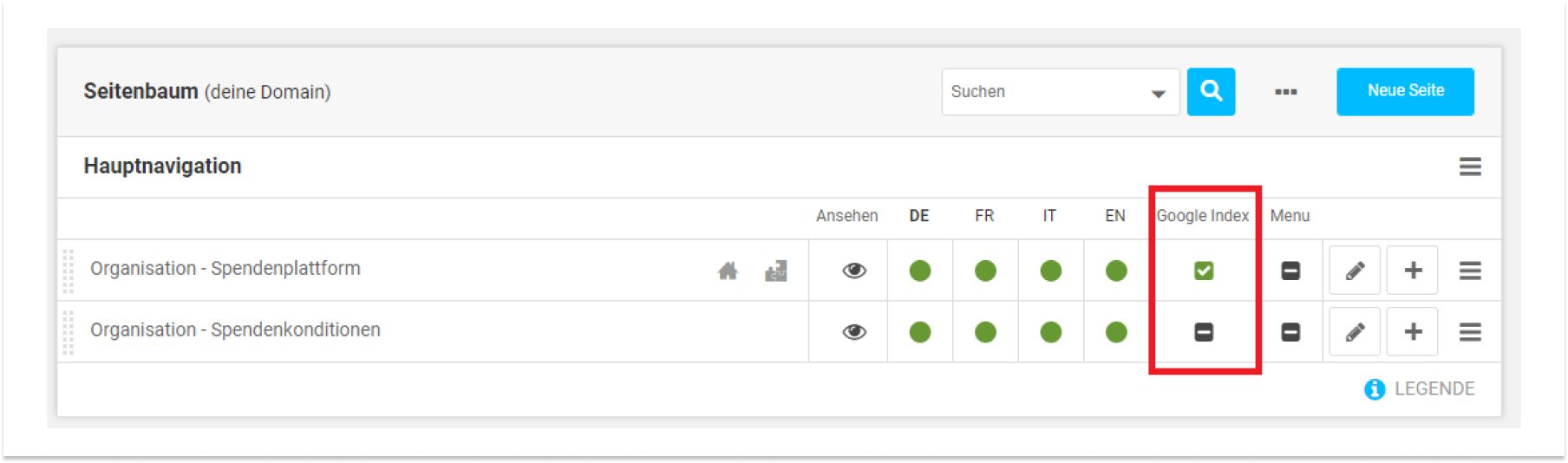 Mit einem Klick können Seiten neu deindexiert werden, sodass diese nicht bei Suchmaschinen (Google, Bing, etc.) gelistet werden. Standardmässig sind alle Seiten auf «indexiert» gesetzt. Sofern mit dem Soulclick CMS, Landingpages für Kampagnen o.ä. gebaut werden, die bei den Suchmaschinen nicht indexiert werden sollen, kann diese Funktion genutzt werden.