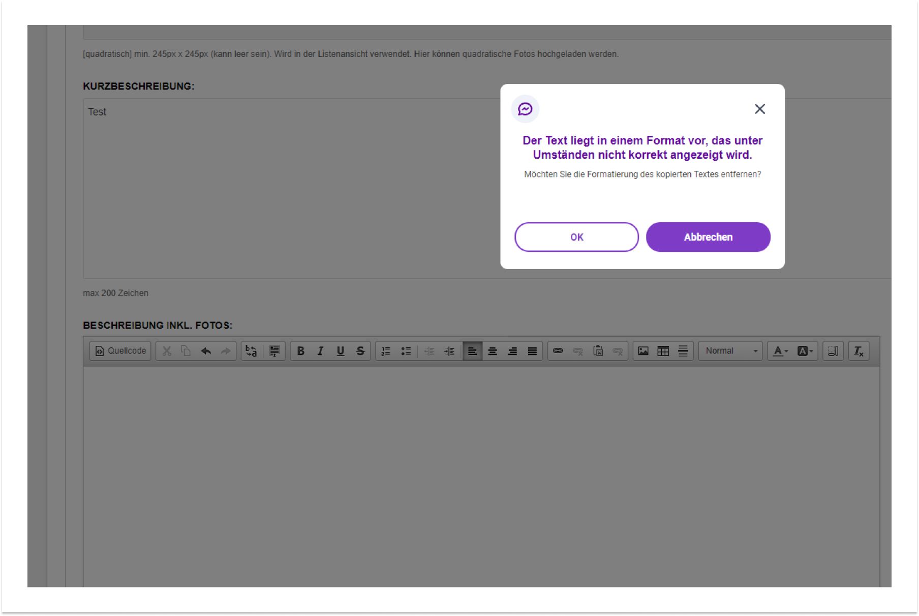 Oftmals werden Landingpage-Texte in Word-Dokumenten o.ä. vorbereitet. Beim Hinüberkopieren muss die Formatierung entfernt werden, damit die globalen Schriftarten, Farben, Titelformate, etc. des Editors richtig angewandt werden. Neu bieten wir deshalb ein entsprechendes Pop-up, wenn Soulclick Fremdformatierungen erkennt. Du kannst dann selbst wählen, ob die Formatierung entfernt werden soll oder nicht.
