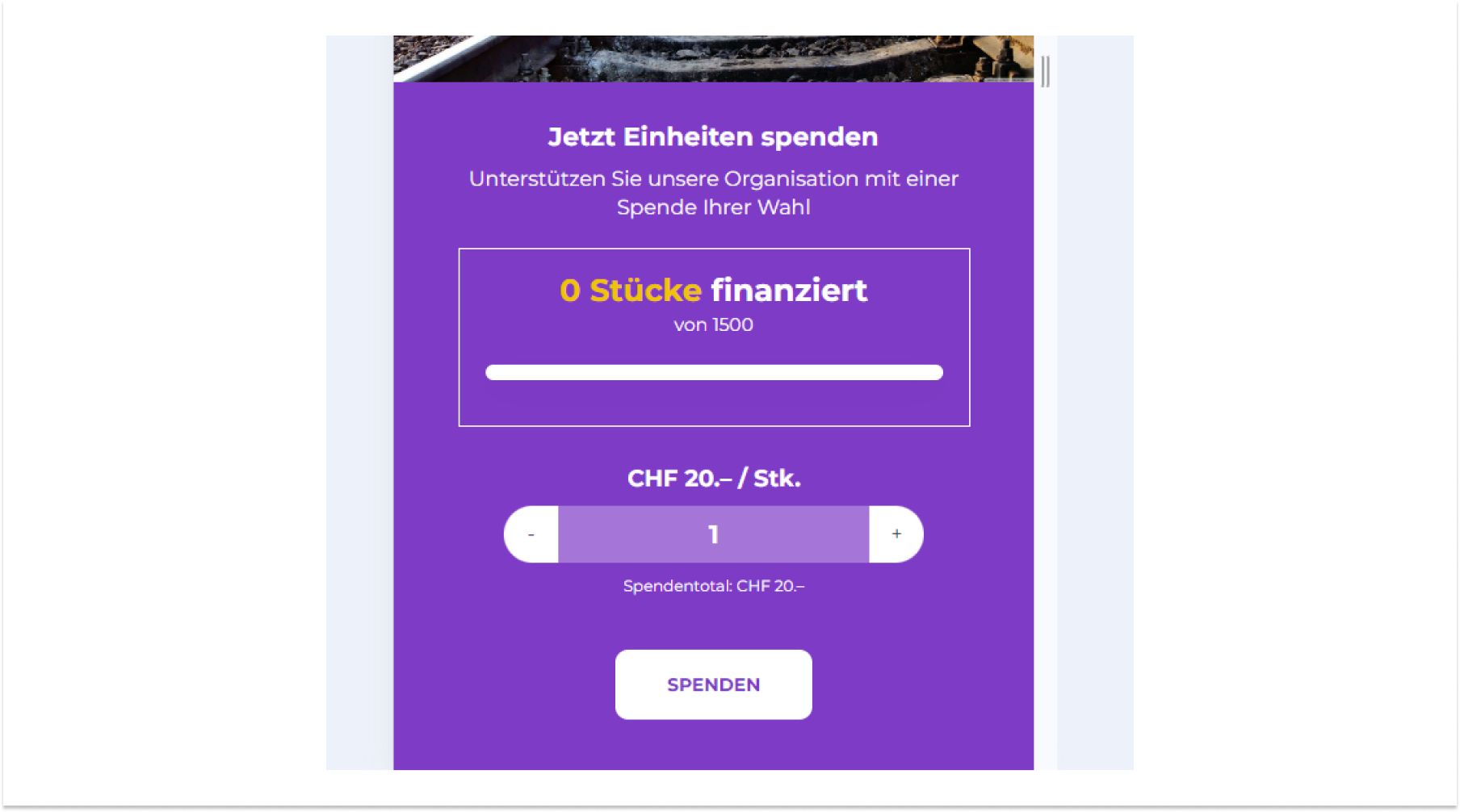 Du möchtest deinen Spender:innen die Möglichkeit bieten eine bestimmte Anzahl Einheiten (z.B. Mahlzeiten, Einrichtungsgegenstände, o.ä.) zu finanzieren? Mit Unit Donations spenden Unterstützer:innen nicht einfach nur einen Geldbetrag, sondern tragen zur Erreichung eines nachvollziehbaren Ziels bei.