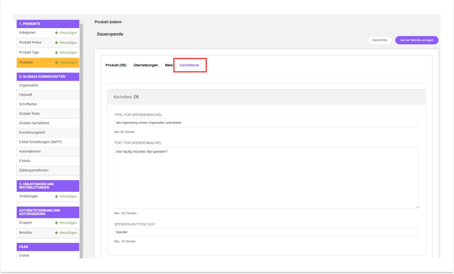 Die Spenden-Kacheltexte können neu global und je Spendenprodukt individuell beschrieben werden. Dies gibt Fundraiser:innen noch mehr Flexibilität, die Fundraisingaktionen entsprechend masszuschneidern.