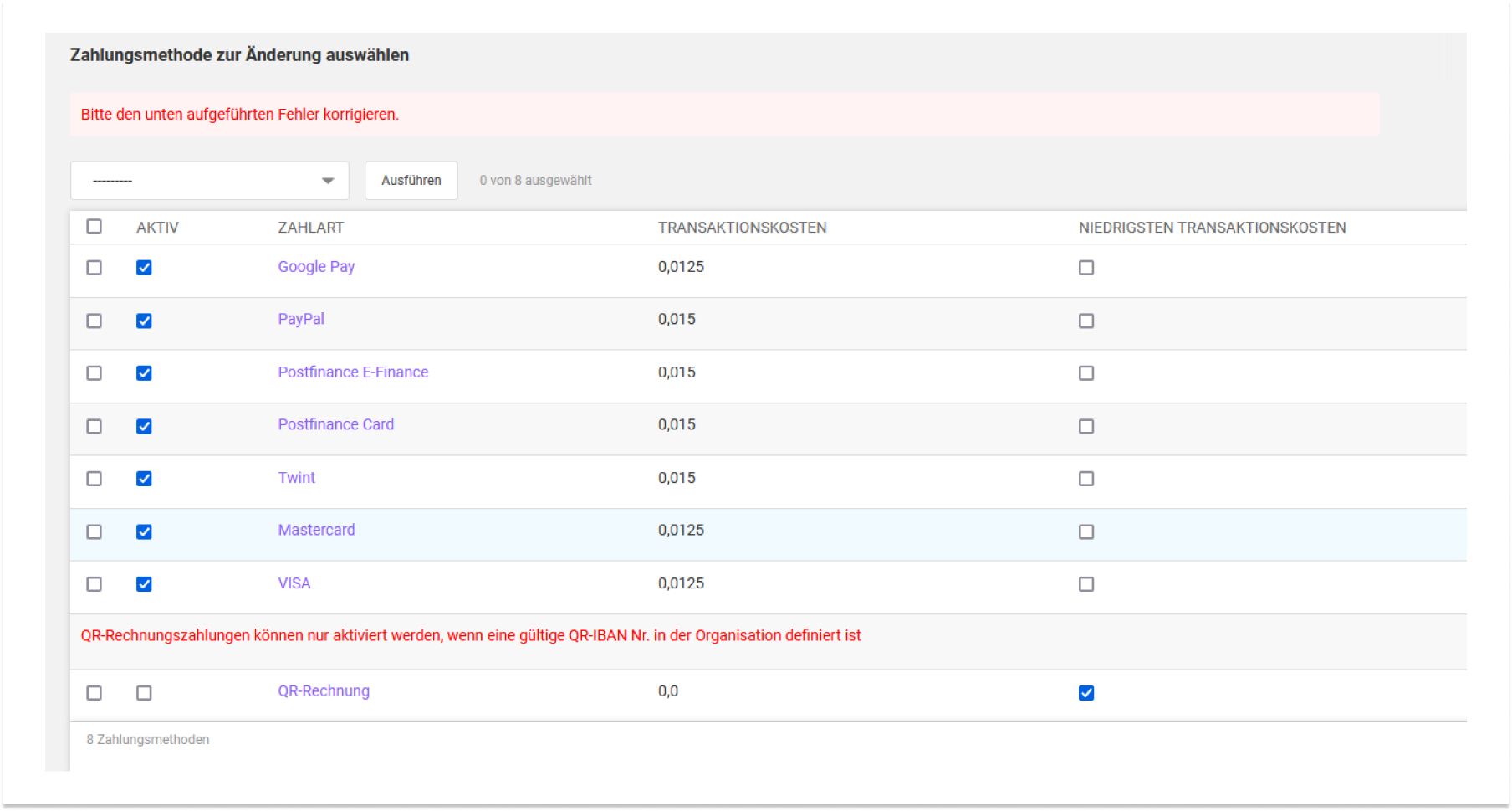 Neu können QR-Rechnungen nur noch aktiviert werden, wenn zuvor eine korrekte QR-IBAN Nummer eingetragen wurde. Hierfür gibt es direkt im CMS ein entsprechendes Error-Handling. Dir wird eine Fehlermeldung angezeigt, sofern die eingegebene QR-IBAN nicht korrekt ist.