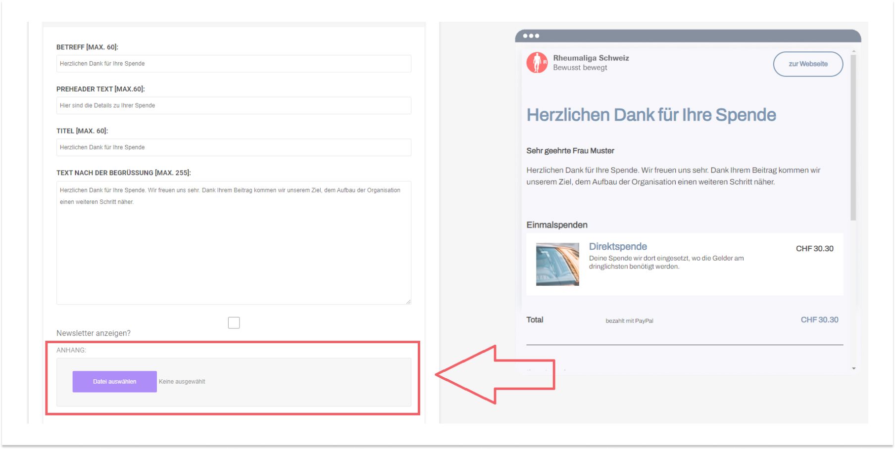 Neu können mit der E-Mail-Verdankung, nach einer Online-Spende, auch Anhänge verschickt werden. Ihr könnt direkt im Soulclick CMS ein global gültiges PDF (z.B. Broschüre, Projektbericht, Spendenurkunde, etc.) hinterlegen. Dieses wird mit jeder Spendenverdankung automatisch verschickt.