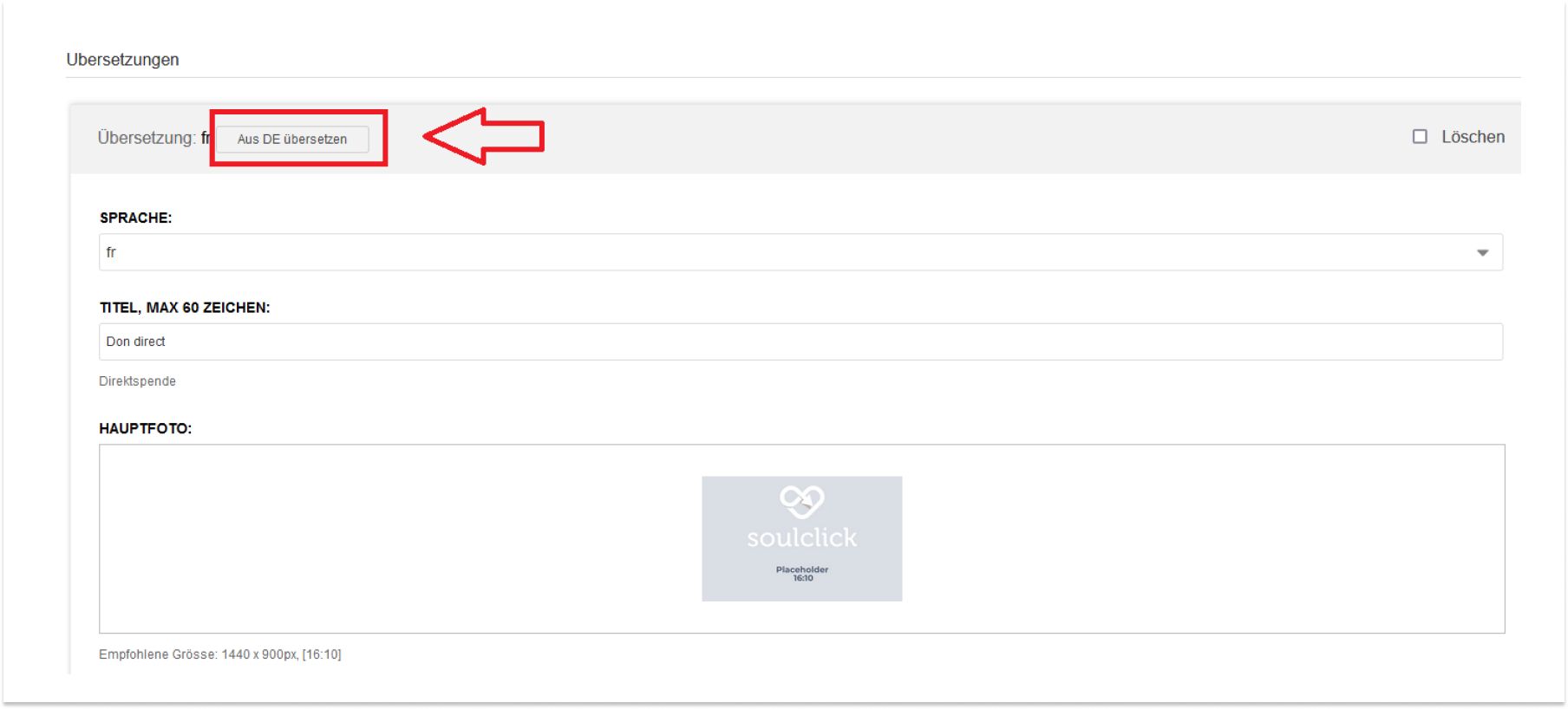 Um den Setup von neuen Spendenprodukten zu vereinfachen wurde eine Inline-Übersetzung eingeführt. Ausgehend von der Basissprache, können die Übersetzungen in weitere Sprachen (z.B. FR, IT, EN) mit einem Klick vollzogen werden. Natürlich empfehlen wir weiterhin, alle Texte zu überprüfen und gegebenenfalls zu redigieren.