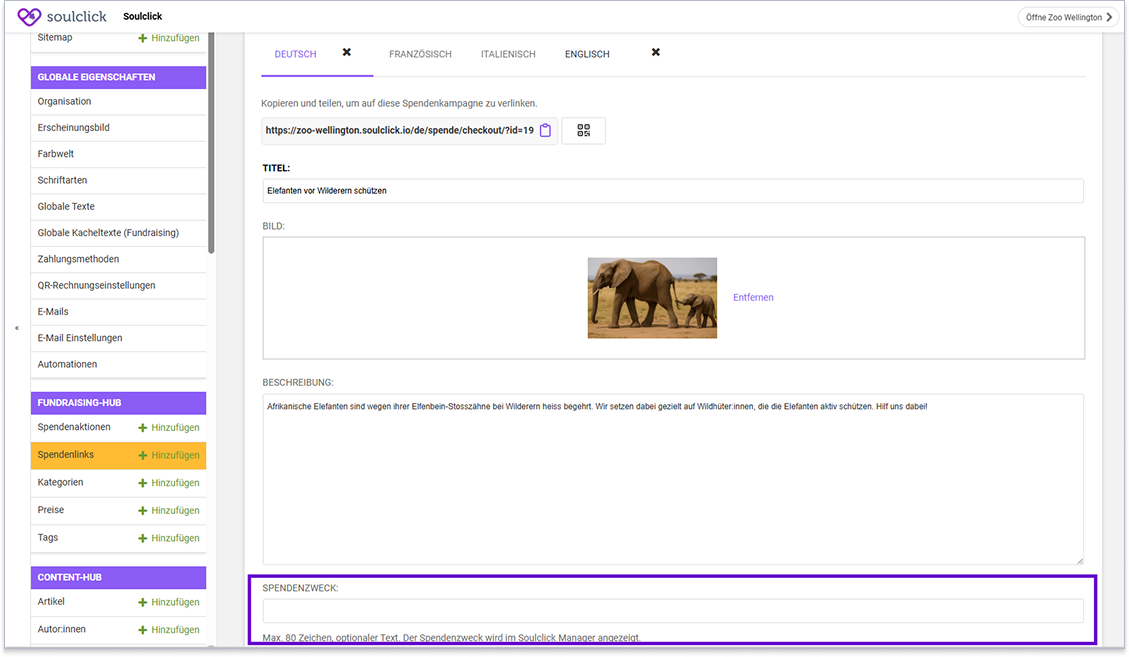 Beim Direct Checkout haben wir beim Erstellen des Produkts das Feld "Spendenzweck" ergänzt, um euch eine genauere Zuteilung zu ermöglich. Den Spendenzweck könnt ihr frei wählen und an eure internen Strukturen anpassen.