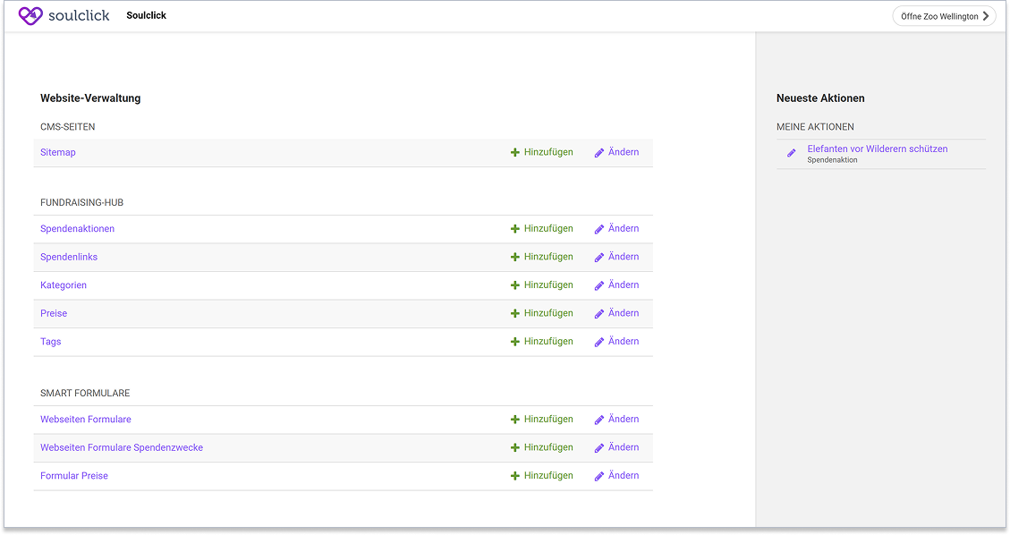 Damit ihr euch im CMS besser zurechtfindet, haben wir einige Begriffe angepasst. Alle eure Spendenprodukte findet ihr neu z.B. unter dem Abschnitt "Fundraising-Hub". Die Direct Checkout Produkte sind neu unter "Spendenlinks" verfügbar. An den Funktionen hat sich dabei nichts verändert.