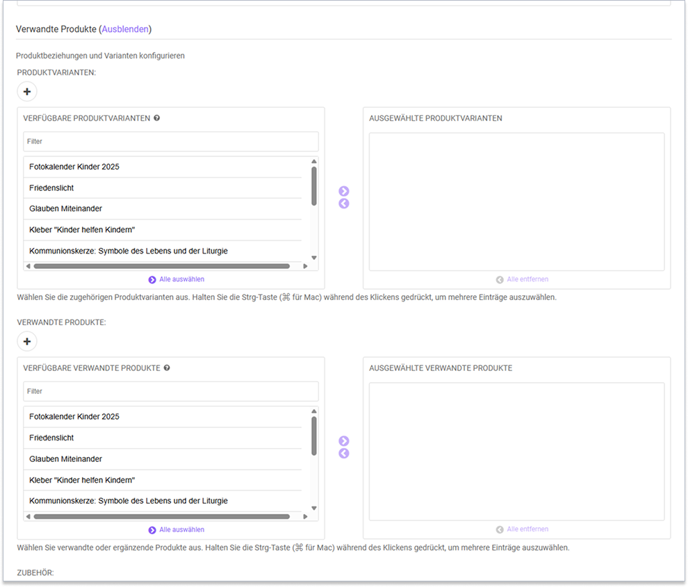 Bei der Auswahl von z.B. verwandten Artikeln haben wir zu einer Mehrfach-Zuordnung gewechselt, da diese übersichtlicher und benutzerfreundlicher ist. Zum Auswählen der Produkte einfach links das Produkt auswählen und mit dem Pfeil nach rechts verschieben. Alle Produkte in der rechten Spalte sind ausgewählt. Wenn Produkte von der Auswahl entfernt werden sollen, können diese mit der selben Logik einfach zurück nach links verschoben werden.
