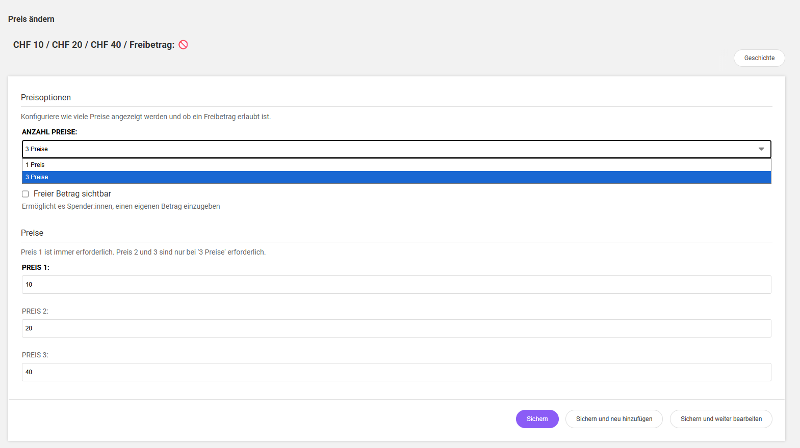 Du kannst jetzt individuell festlegen, wie viele Preisoptionen du deinen Spender:innen anzeigen möchtest – entweder einen einzelnen Preis oder drei vordefinierte Preisvorschläge. Zusätzlich lässt sich optional ein Feld für freie Beträge aktivieren.