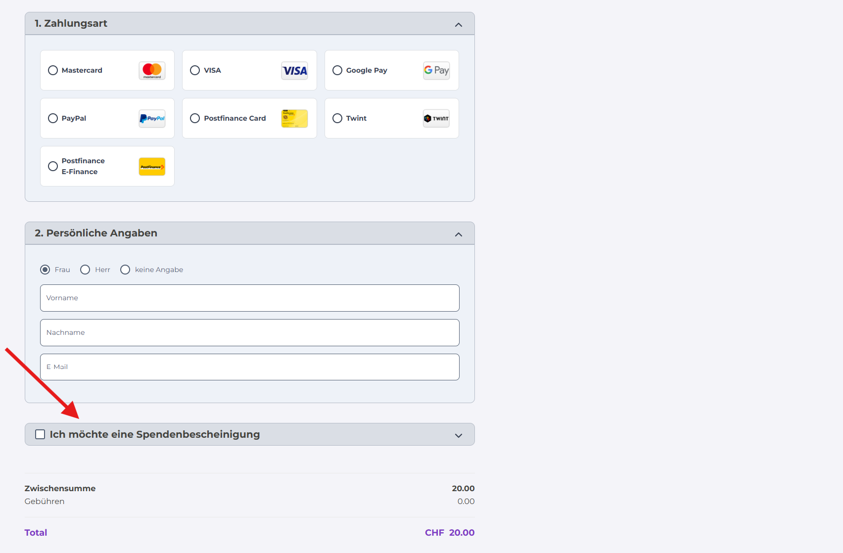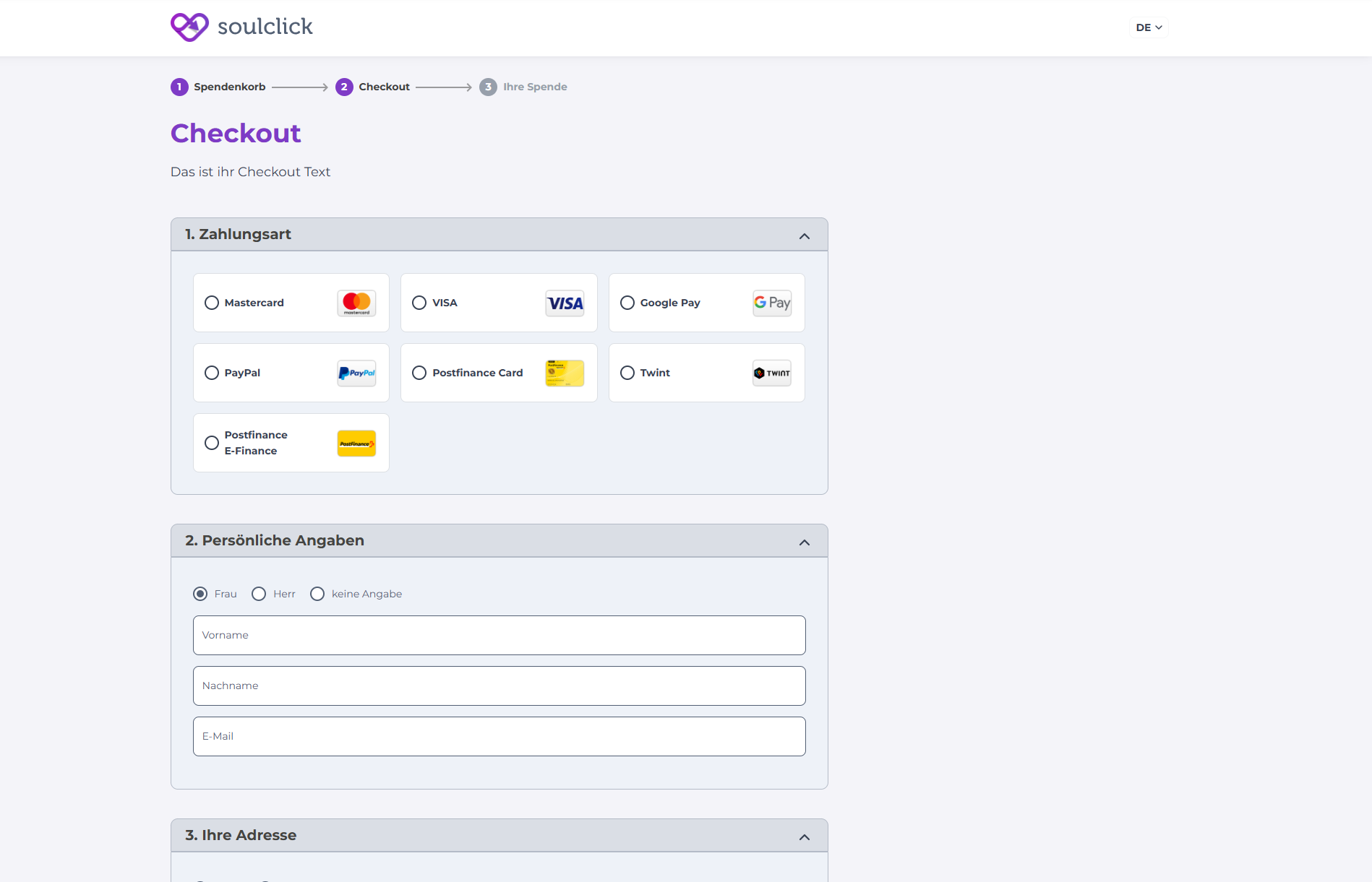 Der neue "Speedy Checkout" ermöglicht das Spenden mit nur E-Mail und Namen – ohne eine vollständige Adresse anzugeben. Die Adressfelder werden nur bei Bedarf (z.B. für Spendenbestätigungen) eingeblendet.