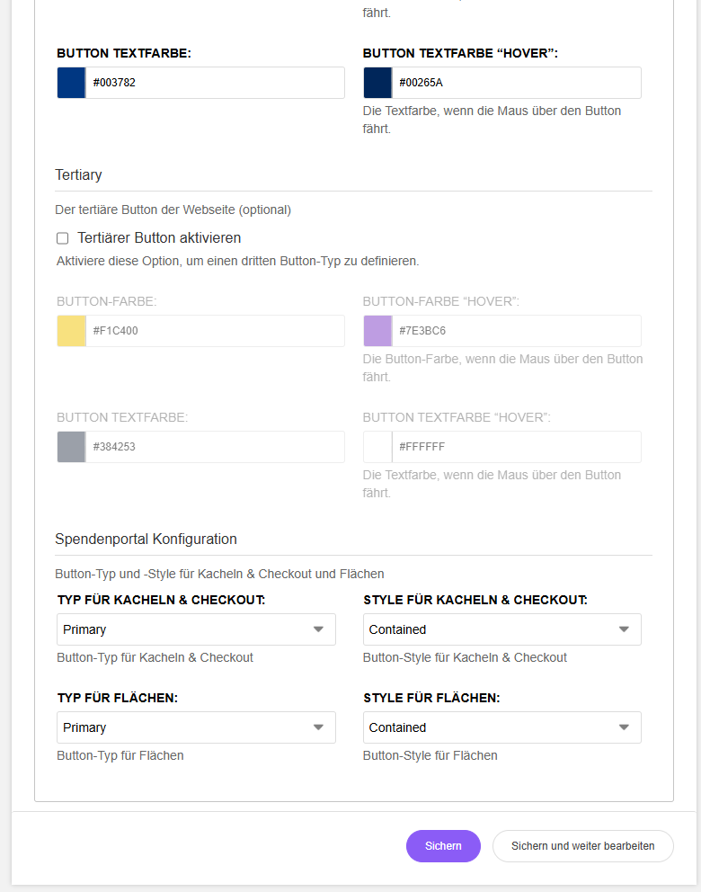 Wir haben die Button-Anpassungsmöglichkeiten deutlich erweitert. Du kannst jetzt eine dritte Button-Farbe für das Spendenportal und farbige Bereiche definieren und festlegen, ob Button-Texte normal oder grossgeschrieben dargestellt werden sollen.