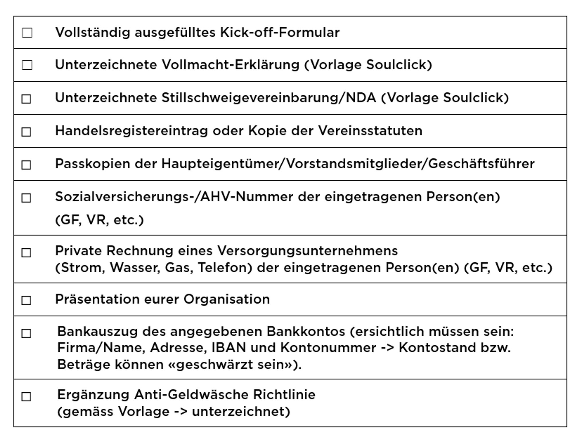 - Zusenden der benötigten Informationen an [email protected] gemäss Checkliste.