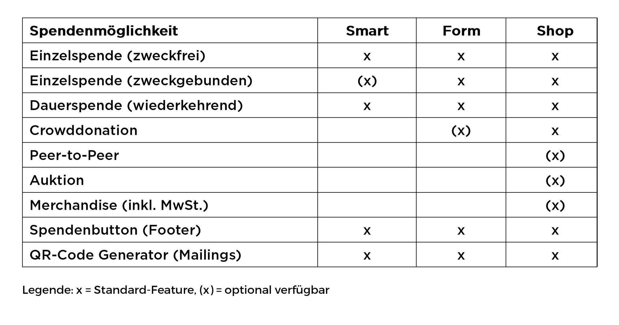 Folgende Spenden- und Transaktionstypen sind mit Soulclick möglich: