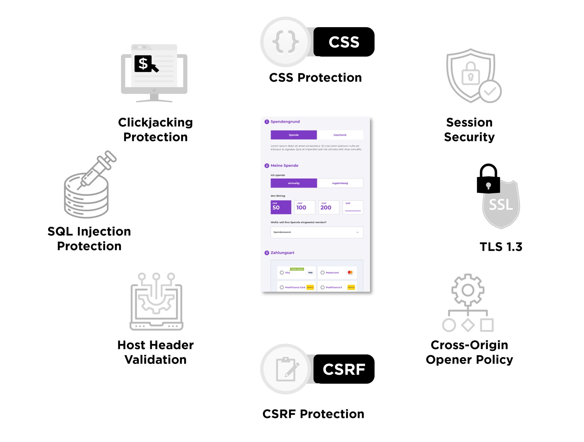 Zusätzlich halten wir folgende Security-Standards ein respektive haben folgende Präventionsmechanismen im Einsatz: