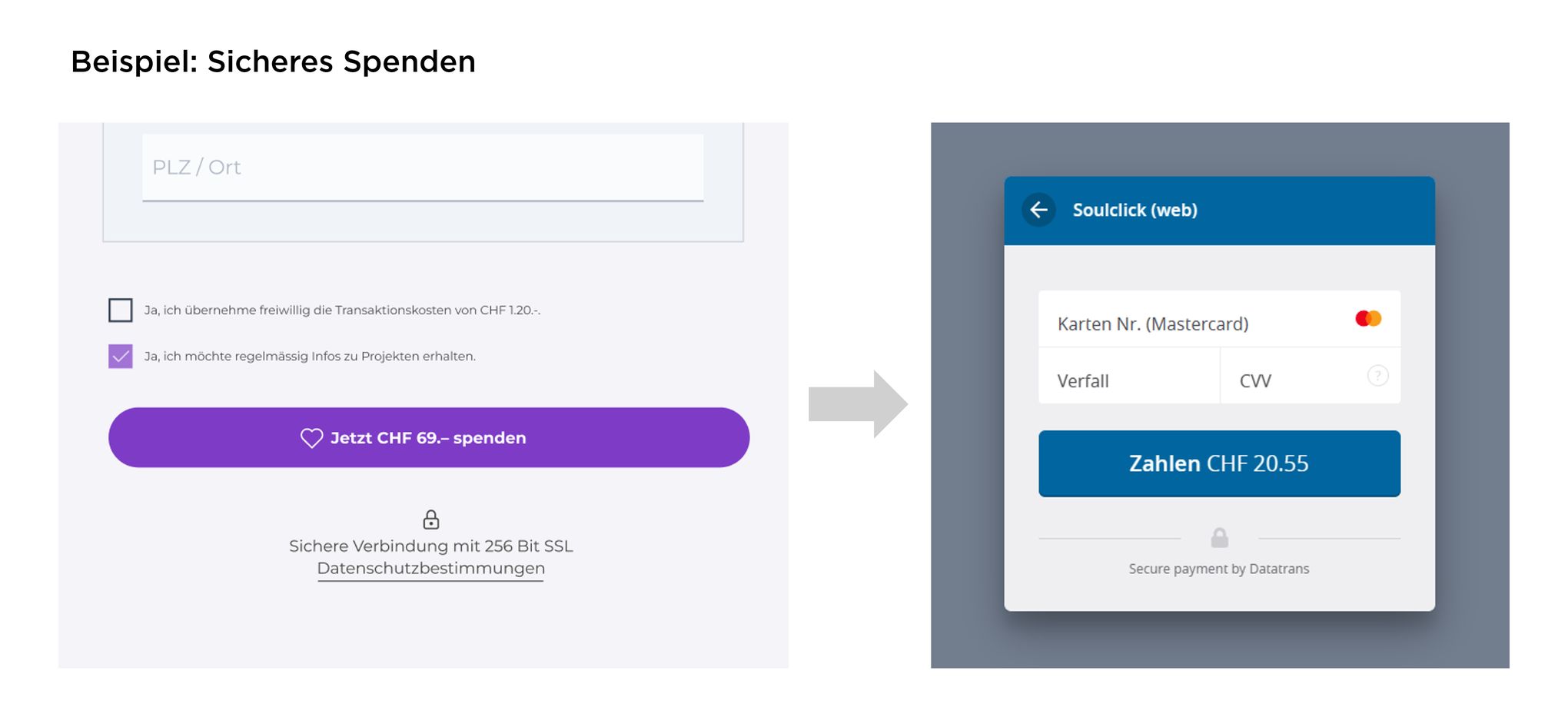 Alle Zahlungstransaktionen werden per 256bit TLS Encryption verschlüsselt durch unser Payment Gateway transferiert. Die Zahlungslösung ist zudem seit 2006 PCI Level 1 (höchste Stufe) zertifiziert und es erfolgen regelmässige Re-Zertifizierungen, Pen-Tests und Audits durch Kreditkarten-Firmen, Auditoren und das PCI-Komitee. Der Transfer erfolgt über eine sichere JSON API-Schnittstelle. Mehr gibt's unter: https://www.datatrans.ch/de/features/security-compliance/