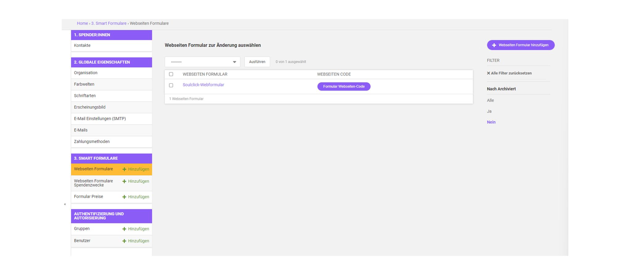 - Nur nicht archivierte Formulare werden auf der Hauptübersicht angezeigt.