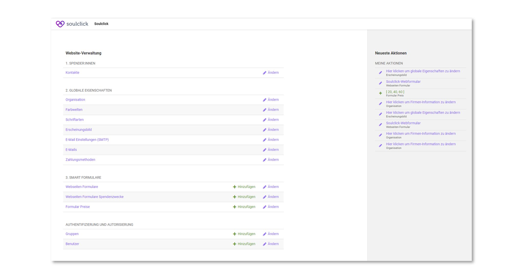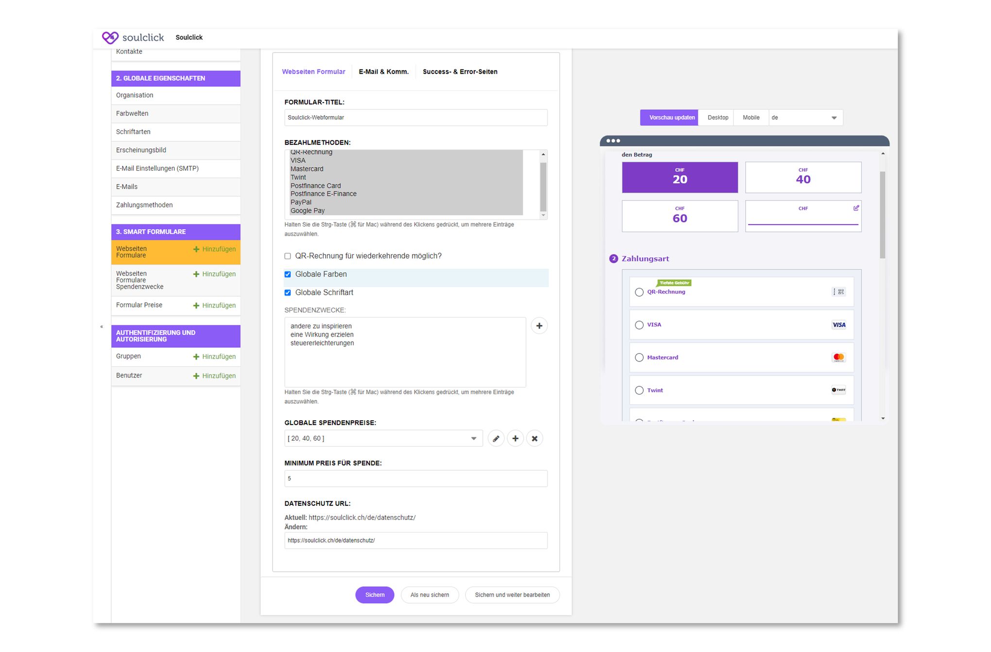 - CMS-Portal: Der Admin-Bereich für eure Organisation, wo Formulare generiert werden und alle bereits erstellten Formulare gelistet sind die auf der eigenen Webseite eingebettet werden können: