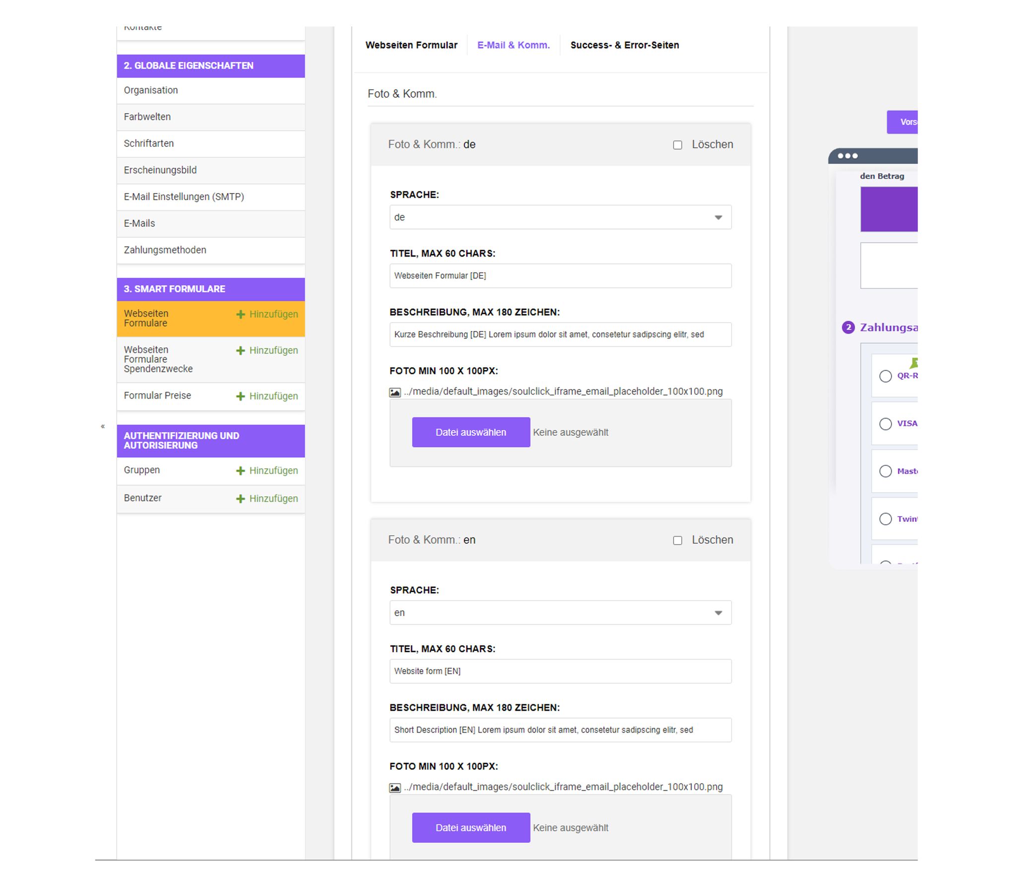 Da ein Webformular wenig Angaben (Bilder & Beschreibungen) hat, können die Inhalte für die E-Mail Kommunikation verfeinert und angepasst werden. Dazu bitte den zweiten Menu-Punkt E-Mail & Komm. klicken und Inhalte anpassen. Die Angaben sollten für jede aufgeschaltete Sprache angepasst werden.