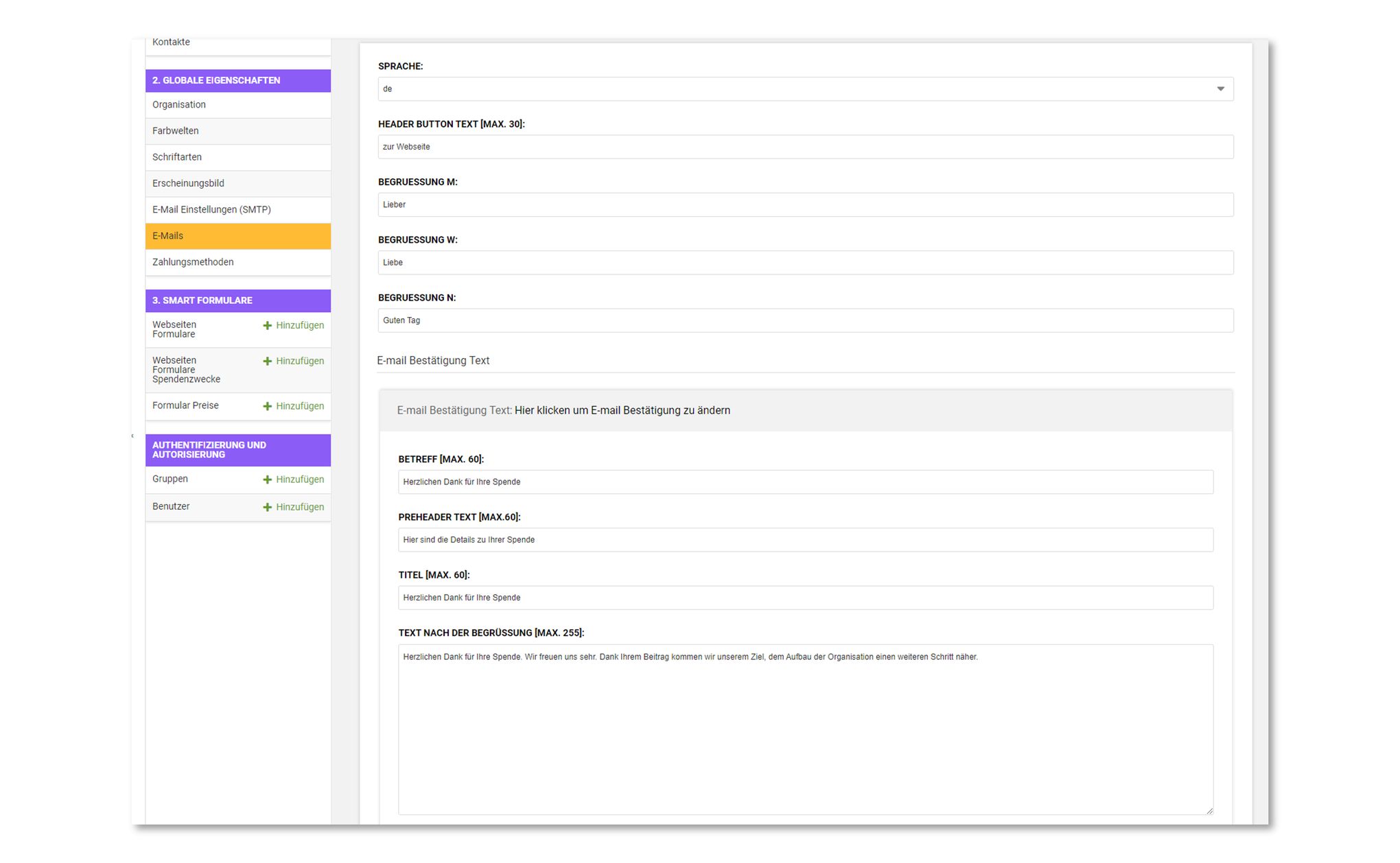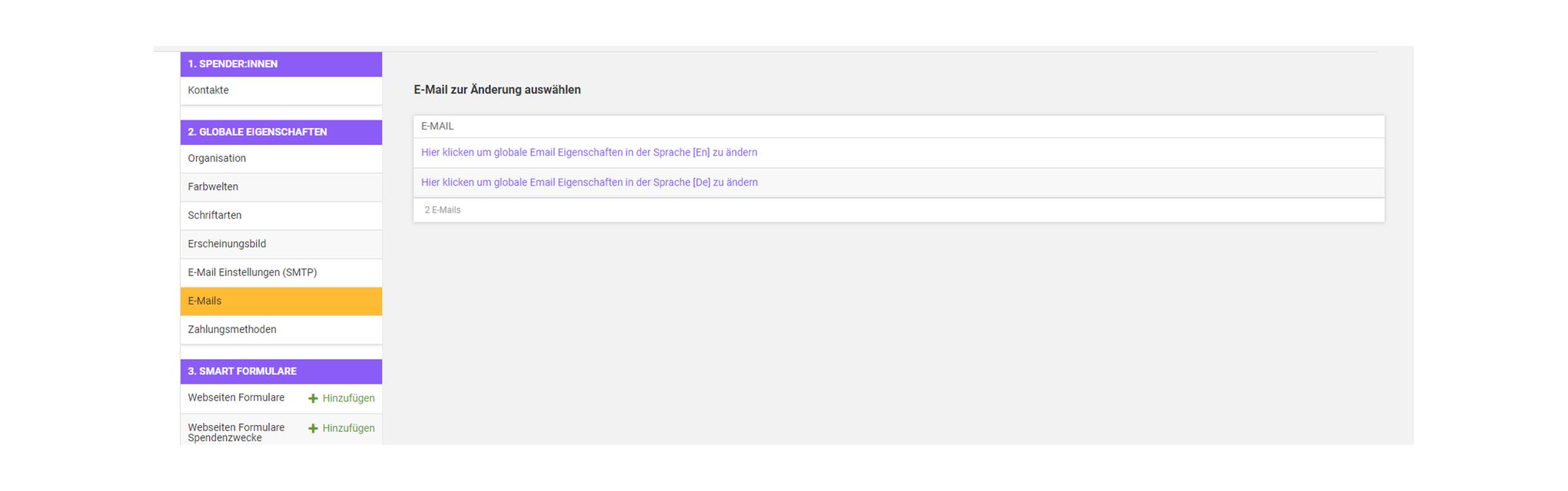 Um Globale E-Mail Texte wie Anreden, E-Mail Betreff, etc. anzupassen ist es nötig den Menu-Punkt E-Mails zu klicken: