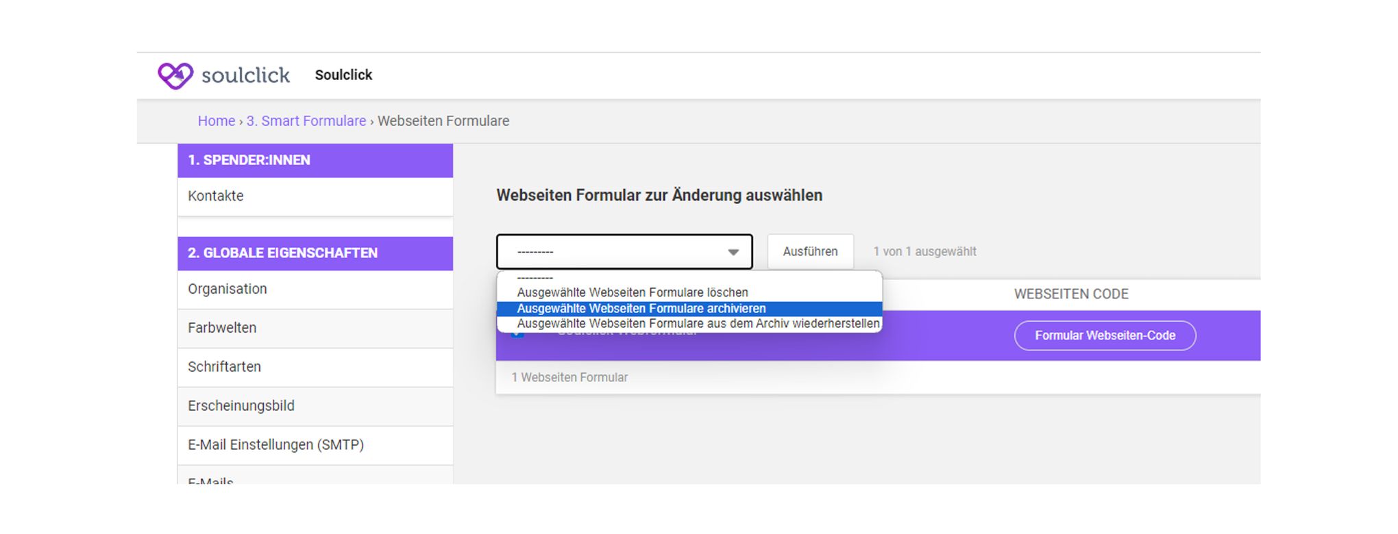 - Um Formulare zu archivieren: Formular auswählen (selektieren) und im Dropdown die Aktion «ausgewählte Formulare archivieren» wählen.